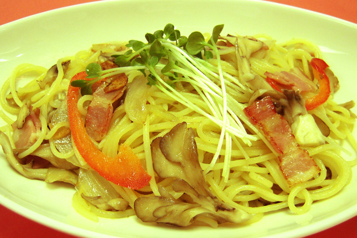 ゆずこしょうの辛味と香りがアクセントの和風パスタ。ベーコンのうまみが、クセのない舞茸にからんで、美味しさを引き立てます。